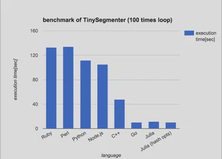 実はTinySegmenterMakerのshogo82148さんが一部のhashのkeyをordしたIntで表現するというさらなる最適化を進めていたので、 ちょっと負けてしまったのですがJuliaのDictを生成するときのhash計算が遅いということをbicycle1885さんが特定してくれたので、Julia本体の最適化が進めば同じくらいにはなりそうだね、ということがわかりました(表のhash optimized)。