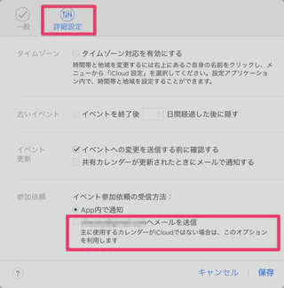3. 「詳細設定」の「イベント参加依頼の受信方法」の設定を「xxxx@yyyy.comへメールを送信」にする