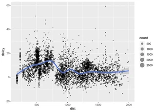 summarise(count = n(), dist = mean(distance, na.rm = TRUE), delay = mean(arr_delay, na.rm = TRUE)) %>%
