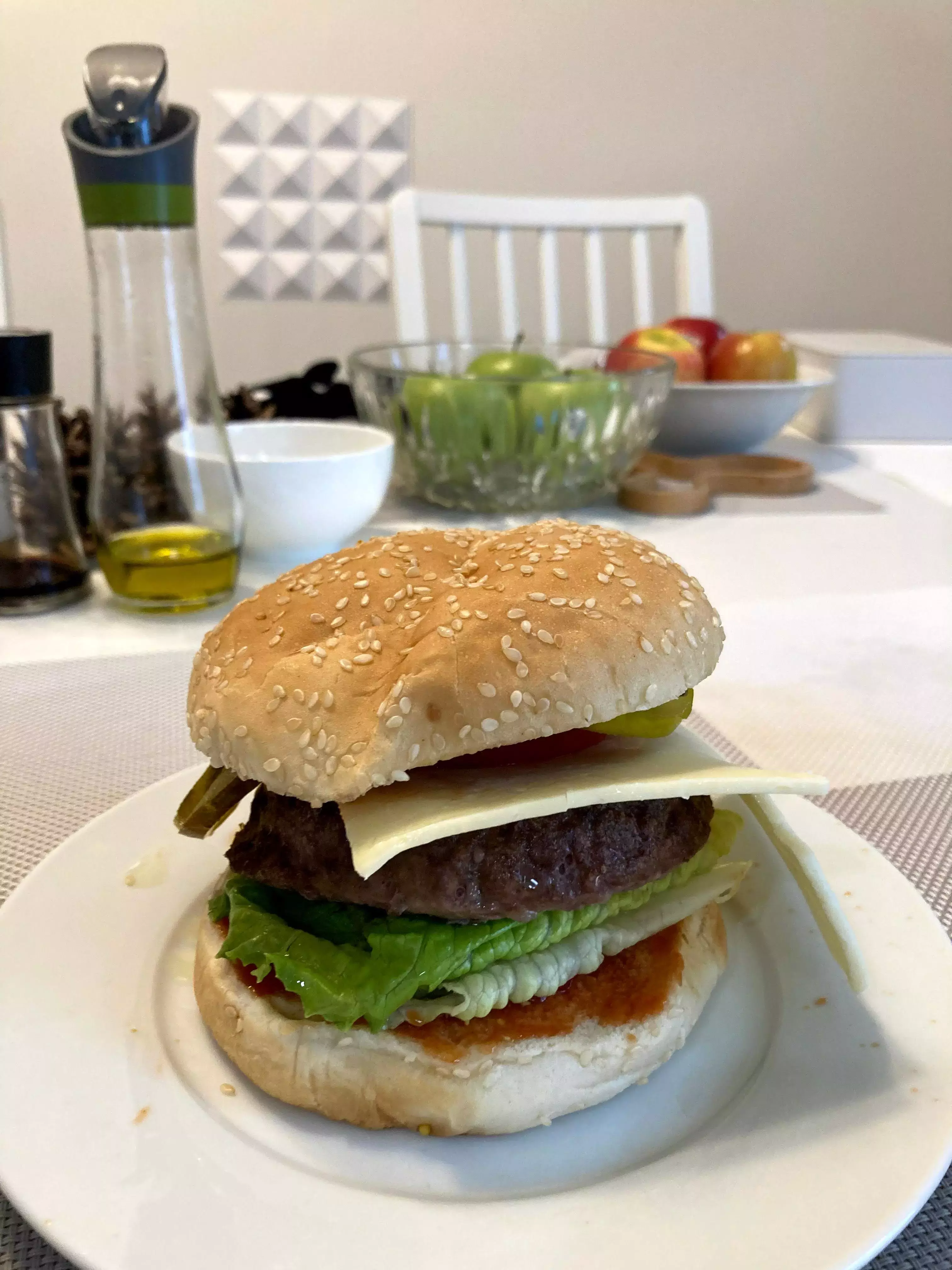 チーズをとけさせるのを忘れたお手製ハンバーガー。ハンバーガー用の冷凍パティとパンを買ってきて挟むだけのお手軽品。