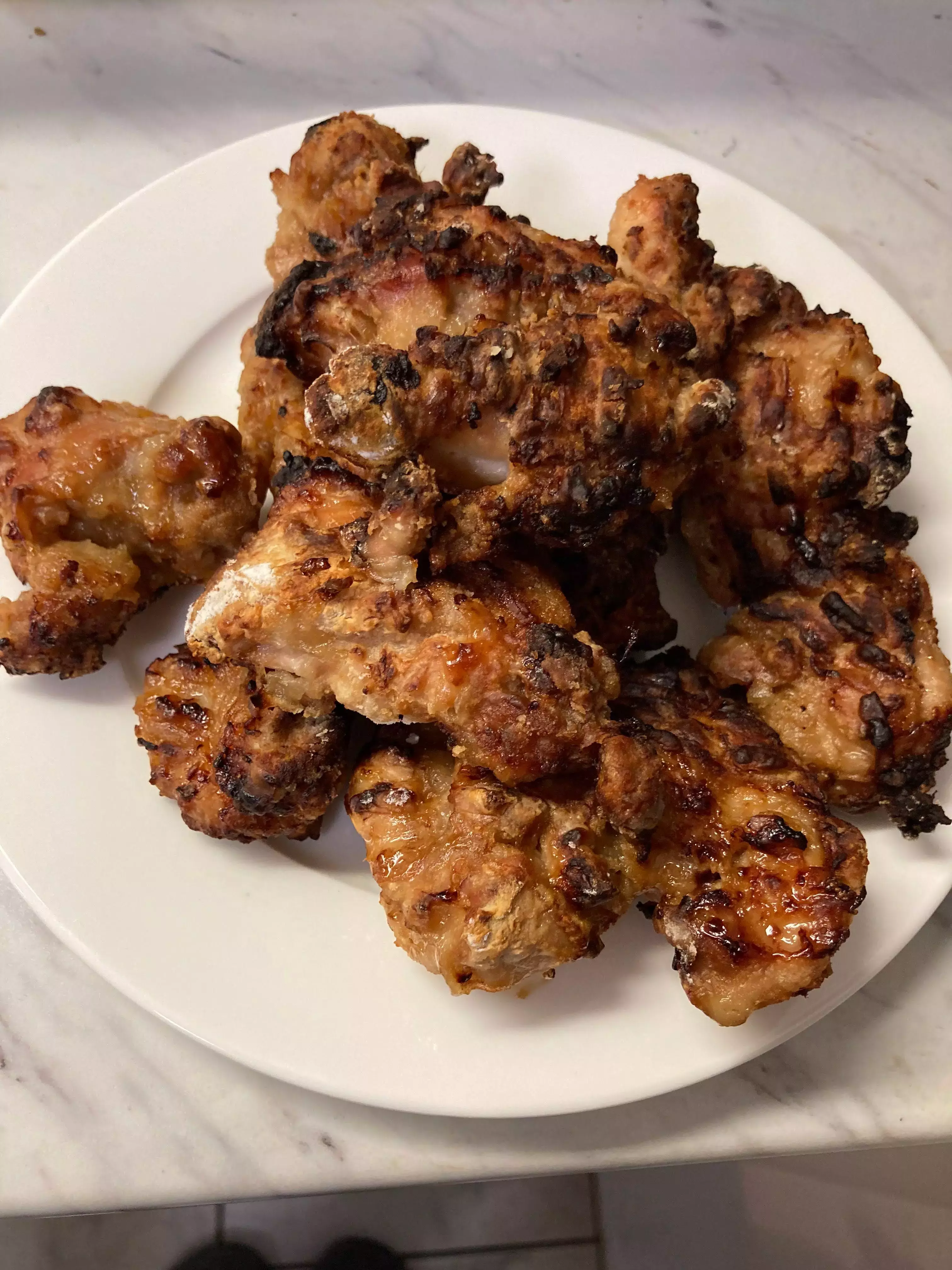 エアフライヤーで揚げた唐揚げ(レシピ)。こっちだと肉は塊でドンと売ってることや、油を固める製品が高いので、エアフライヤーでトンカツや唐揚げをしてる